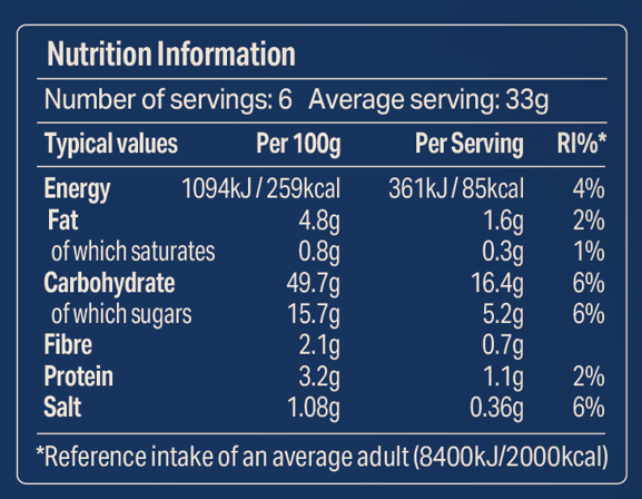 Water, Flours (Rice, Chickpea, Maize), Sugar, Starches (Potato, Maize), Blueberries (6%), Humectant (Vegetable Glycerol), Rapeseed Oil, Raising Agents (Disodium Diphosphate, Sodium Hydrogen Carbonate, Calcium Chloride), Dried Egg, Emulsifier (Mono- and Diglycerides of Fatty Acids, Polyglycerol Esters of Fatty Acids), Bamboo Fibre, Dried Egg White, Stabiliser (Xanthan Gum), Salt, Citric Acid, Preservative (Potassium Sorbate), Natural Flavouring.
